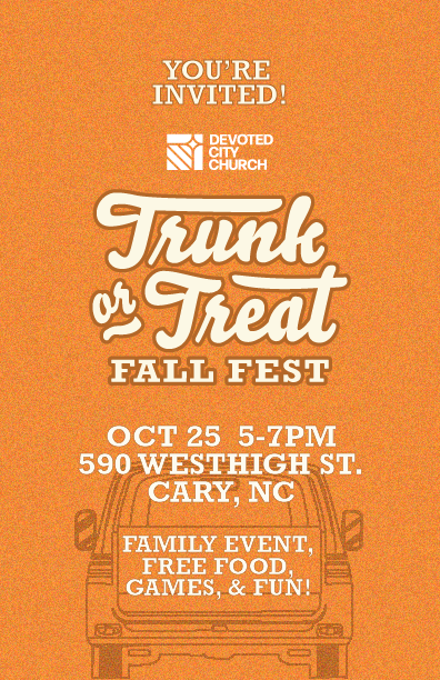 This is our second year offering Trunk or Treat at our Cary campus. We’re excited to provide this fun, free event for families in our church and in our community. You’ll find a downloadable flyer below – just click Invite and share this with your friends and neighbors.